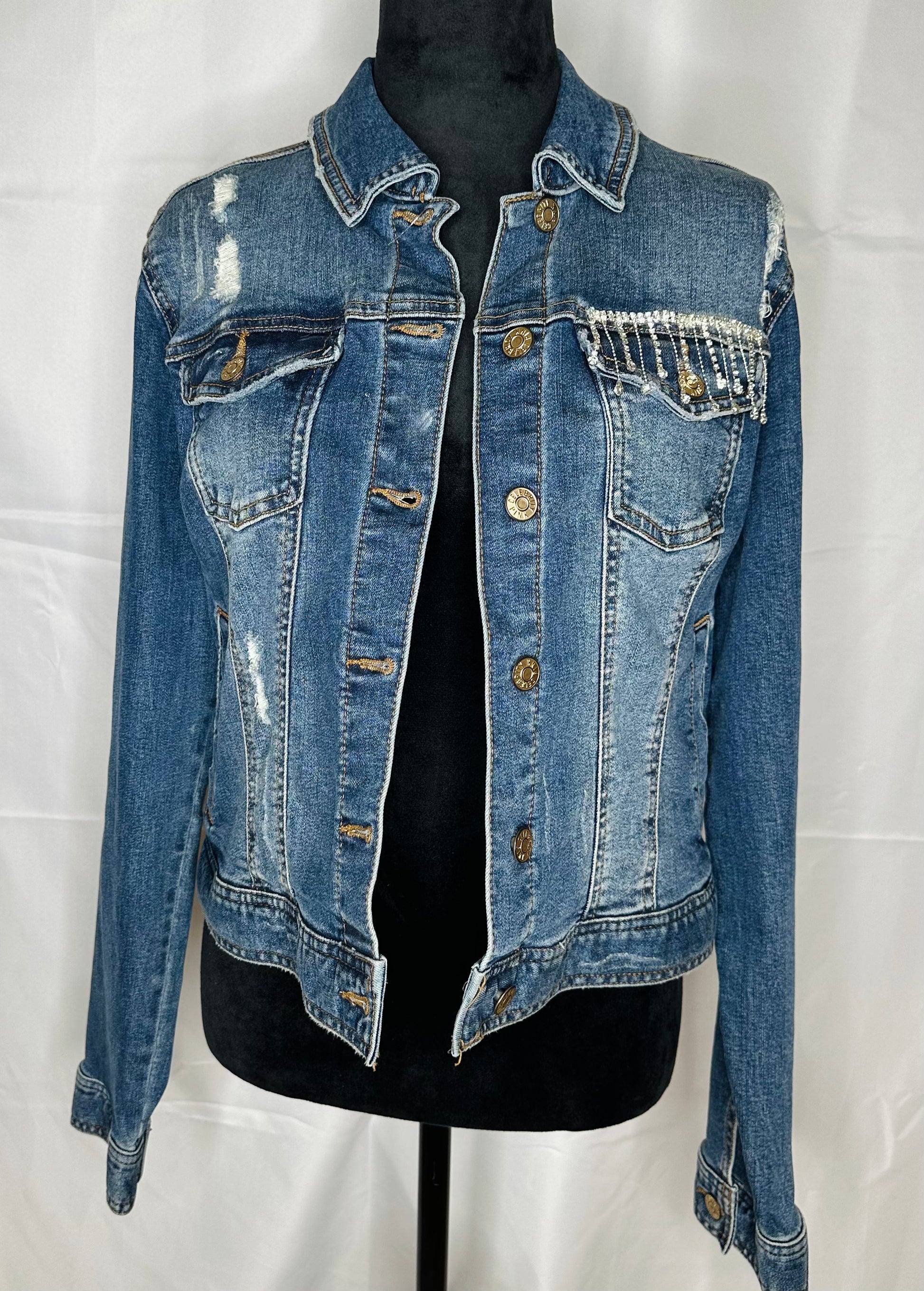 - Detailing: Satin patch with white fringe and AB crystal strip. Front pocket AB drop crystal detail. Distressed effect on demin.